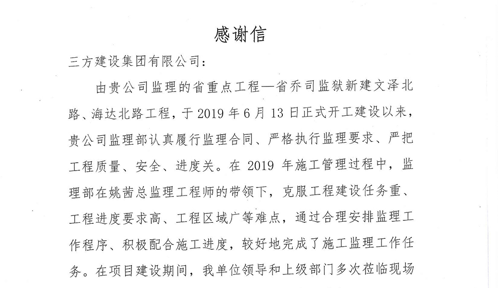 集团收到乔司监狱感谢信