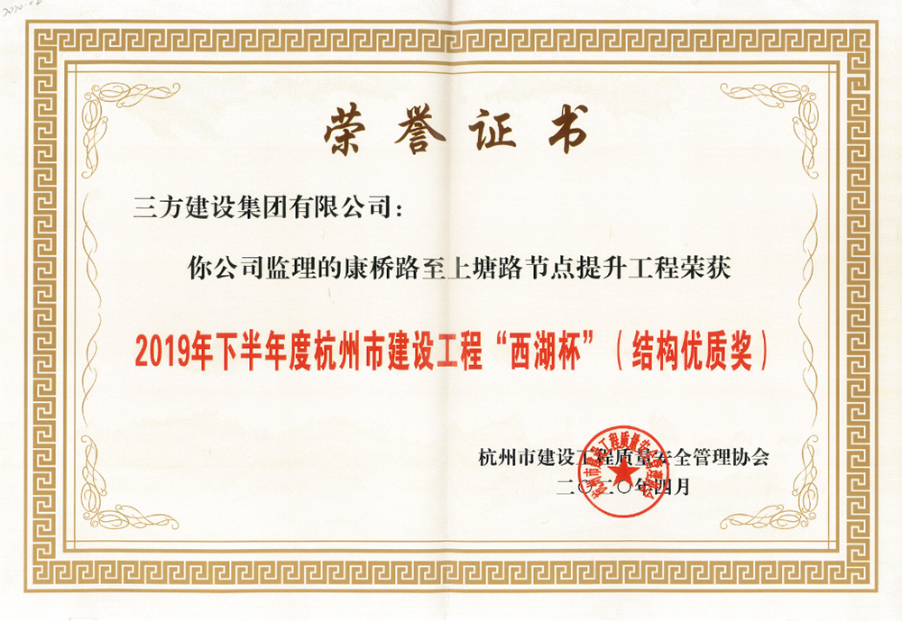 2020年5月12日,上塘路节点提升工程高架桥梁上下匝道部分荣获余杭区建设工程“结构优质奖”。这是本工程继去年4月份主线高架桥梁后第二次获得该奖项,同时在今年4月16日,本工程还荣获2019年下半年度杭州市建设工程“西湖杯” (结构优质奖)。