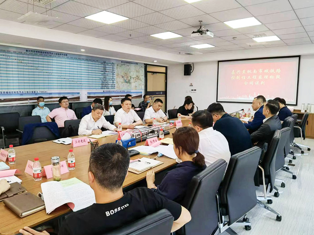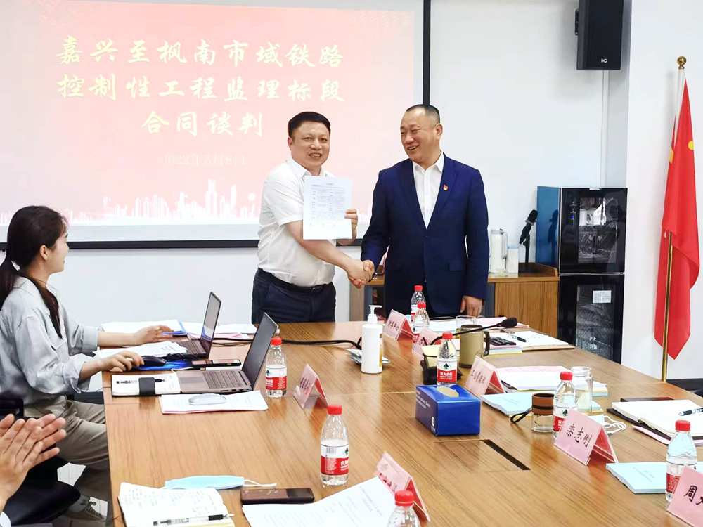 5月8日,集团董事长吴祖跃带队参加嘉兴至枫南市域铁路控制性节点工程(嘉兴南站)监理合同谈判会。会议由嘉兴市铁路与轨道交通投资集团(以下简称嘉兴铁投)组织召开,嘉兴铁投总经理周大勇、副总经理栾志刚、嘉兴市铁路指挥部徐峰平及铁投相关部室负责人参加。