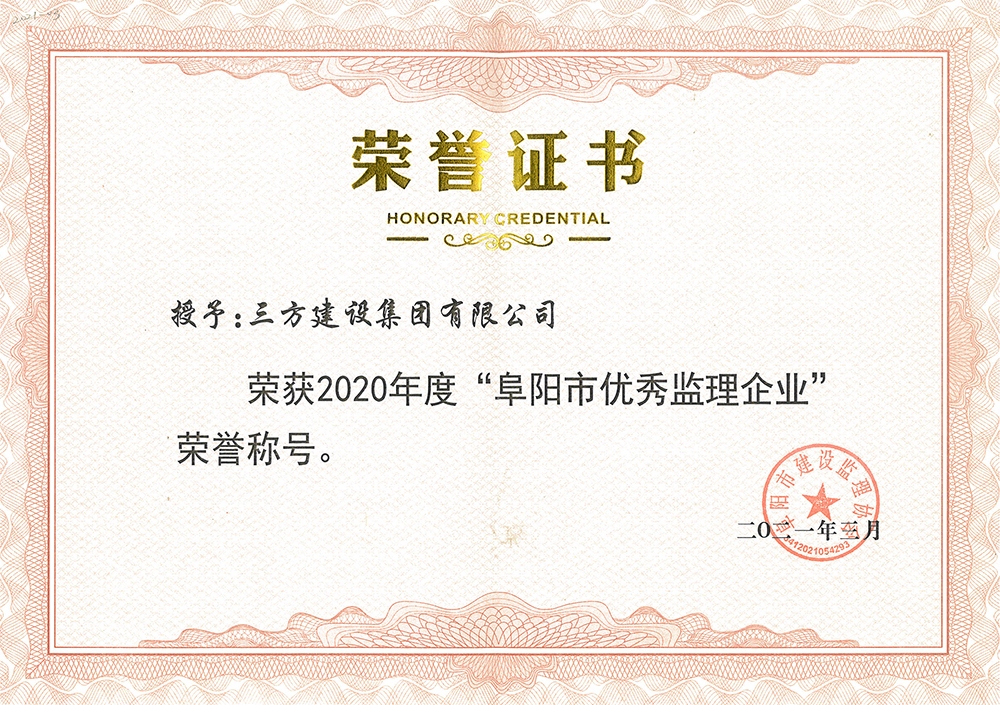 3月18日,阜阳市建设监理协会授予集团“2020年度阜阳市优秀监理企业”荣誉称号,吴祖跃、杨超、季康忠、洪理红荣获“2020年度阜阳市优秀总监理工程师”。 集团将继续努力,开拓创新,为当地工程监理事业做出更大的贡献。