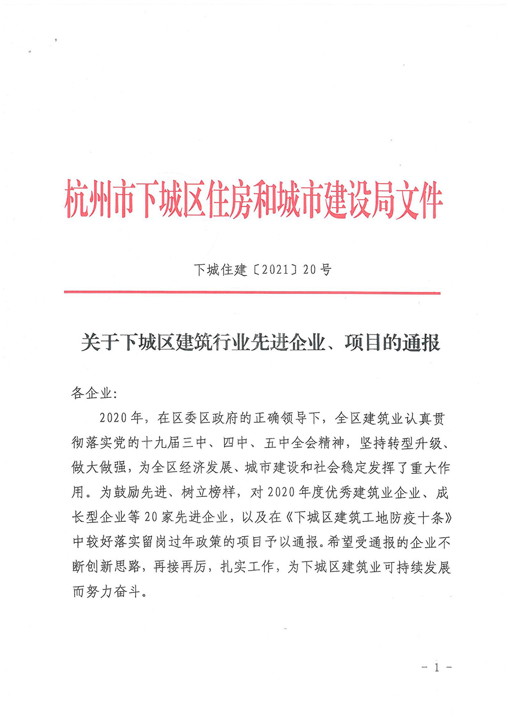 近日,杭州市下城区住房和城市建设局发文,表彰2020年度优秀建筑业企业。我集团荣获“2020年度下城区建筑行业先进企业”的殊荣。