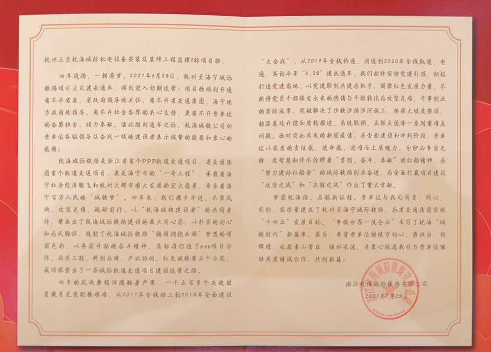 梦圆杭海路,启程新征程。各参建单位在浙江交投的正确引领、海宁政府的大力协助、所有参建人员的不懈努力下,高质量、高水准、高效率地建成了杭州至海宁城际铁路,向海宁人民交出了一份满意的答卷。三方集团参与了全线供电、机电安装及装修、人防三个标的监理,与杭海城铁通力合作,同心同责,对此,浙江杭海城际铁路有限公司发函致谢,衷心祝愿未来再度携手,共创新篇;我集团也将在今后的工作中继续秉承“精品、人品”的工匠精神和“诚信、创新”的企业作风,在轨道交通的建设中砥砺前行,不负使命,为轨道交通事业做出新的巨大贡献。