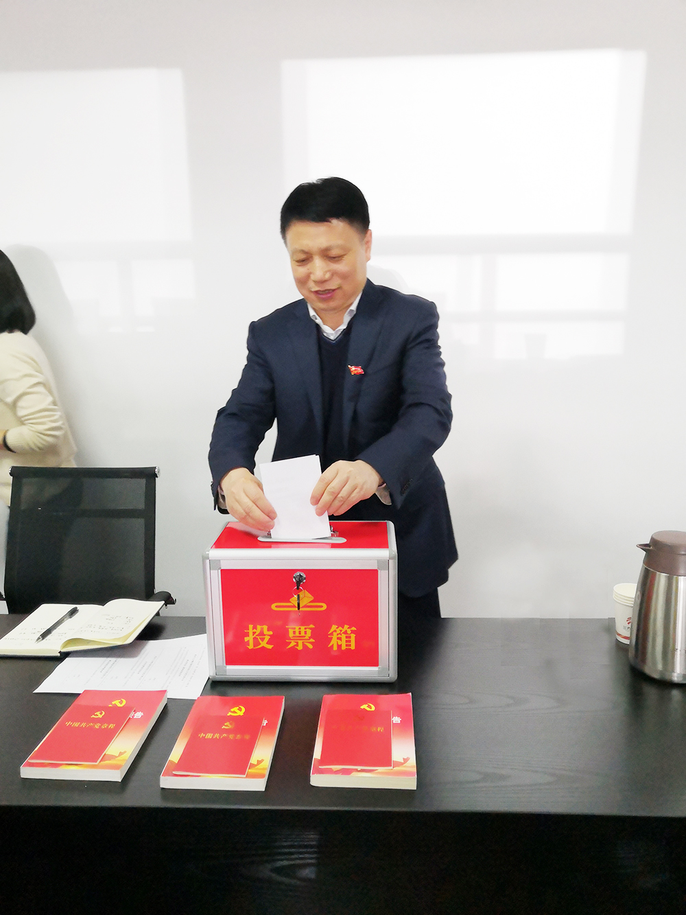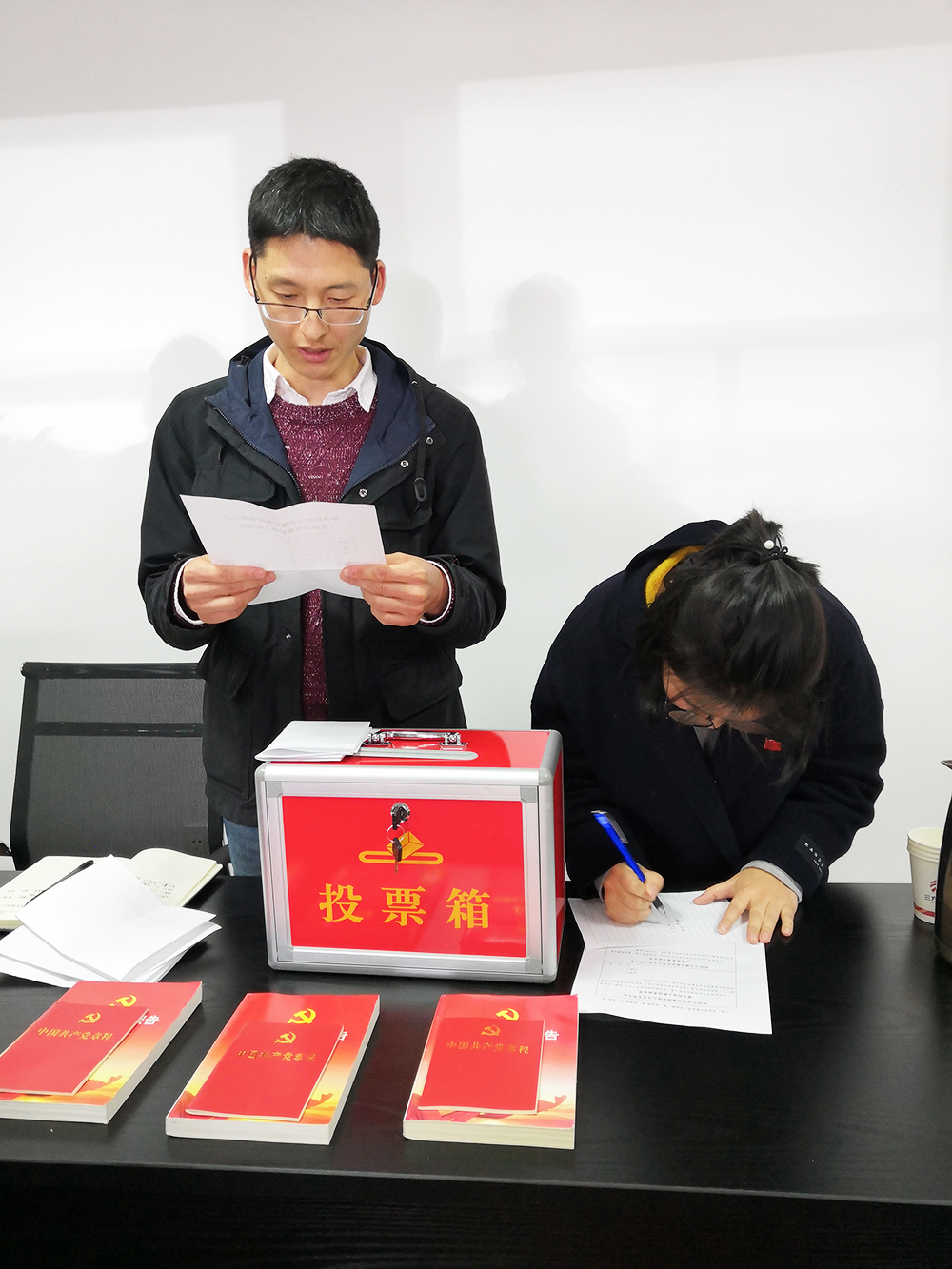 支部委员会第一次党员大会。大会的主要任务和议程为选举第一届党支部委员会和支部书记。本次会议应到党员7名,有选举权党员7名,因事请假1名,实到6名,其中有选举权党员6名。会上,全体党员一致通过了选举办法(草案),通过差额选举出了4名支部委员,并通过召开支部委员会选出了1名支部书记,圆满地完成了本次大会的主要任务和议程。
