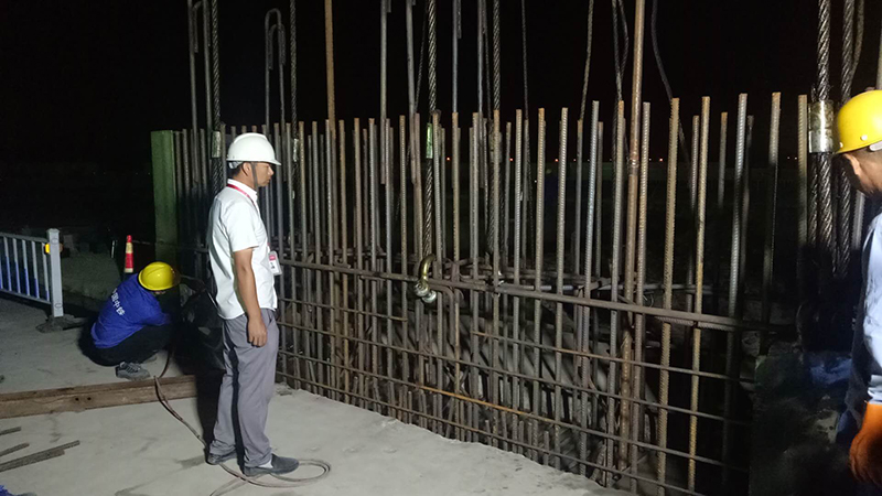 首幅地下连续墙编号为8#S37,钢筋笼的长度为63m,分成两段进行吊装。随着指挥员的一声令下,首幅地连墙钢筋笼被履带吊缓缓吊起。虽然本次钢筋笼重量大,钢筋笼吊装风险高等特点,但是在各方的共同配合下,安全顺利地完成了钢筋笼入槽。该地连墙钢筋笼顺利入槽,极大鼓舞了大家的士气,也为后续工程的优质实施奠定了坚实的基础。