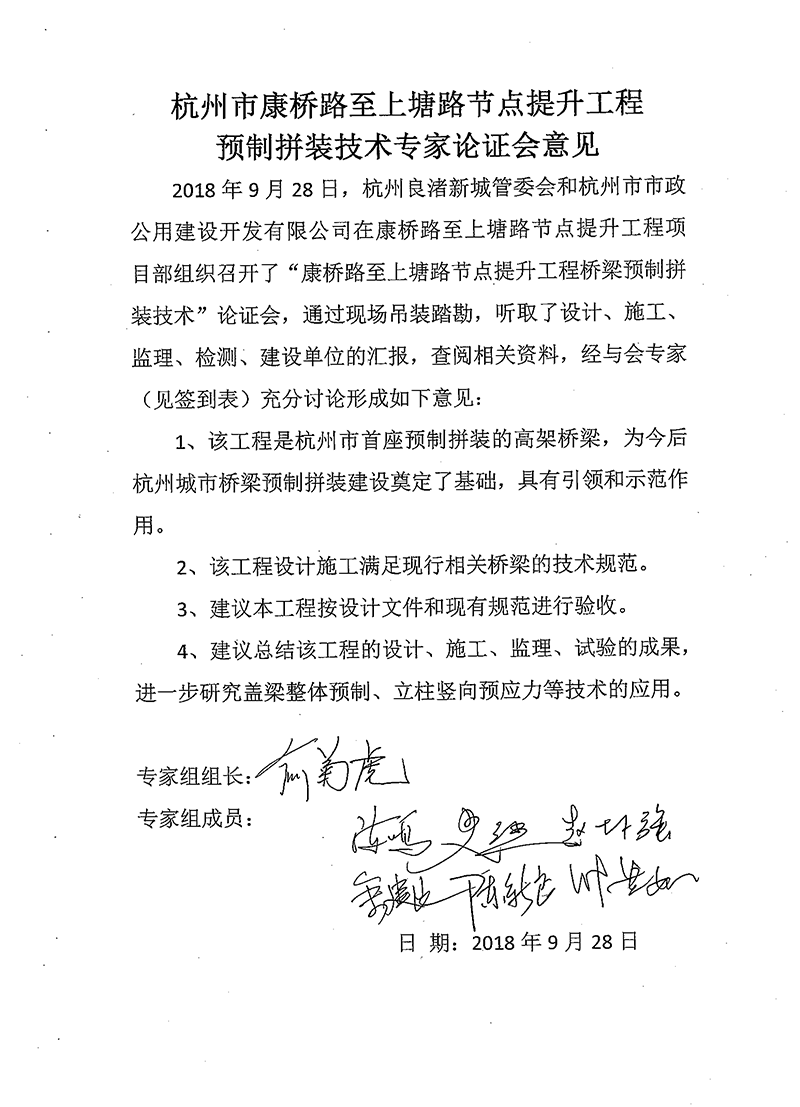 2018年9月28日下午预制拼装技术专家论证会的顺利召开,经与会专家充分讨论形成如下意见:康桥路至上塘路节点提升工程是杭州市首座预制拼装的高架桥梁,为今后杭州城市桥梁预制拼装建设奠定了基础,具有引领和示范作用。