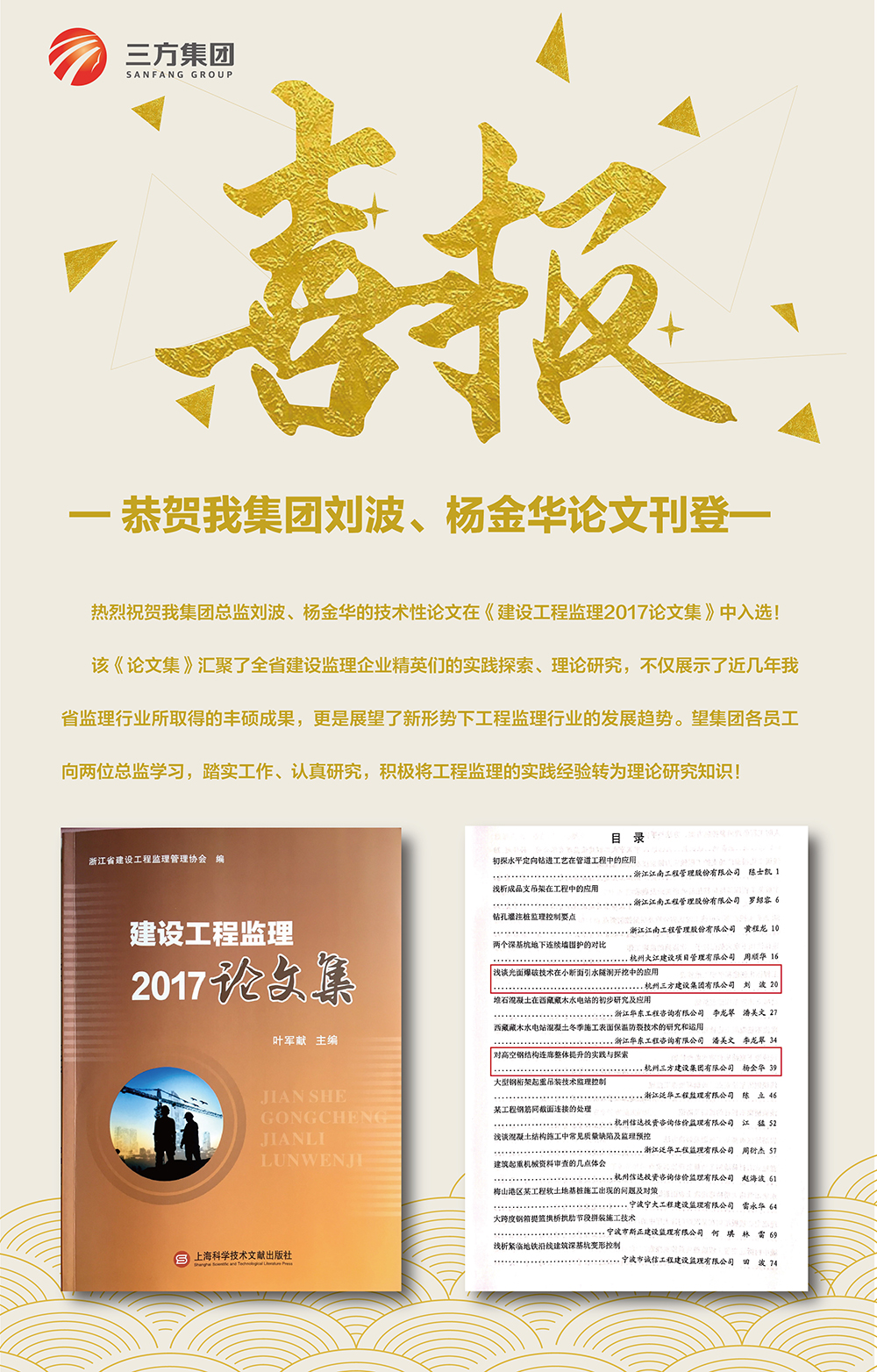 热烈祝贺我集团总监刘波——《浅谈光面爆破技术在小断面引水隧洞开挖中的应用》,杨金华——《对高空钢结构连廊整体提升的实践与探索》的技术性论文在《建设工程监理2017论文集》中入选!两位同志在各自管理的青田县城引水延伸改建工程和东阳市总部中心一期G地块工程中就隧洞工程和钢连廊施工技术难点做了充分论述,文中素材鲜活、描述详尽、见解独到,充分展现了作者精湛的技术能力,严谨的工作作风。