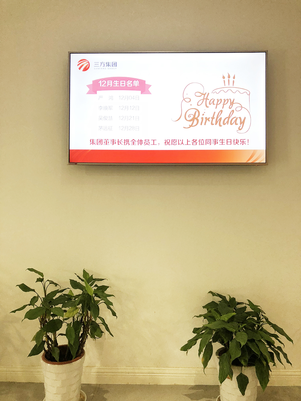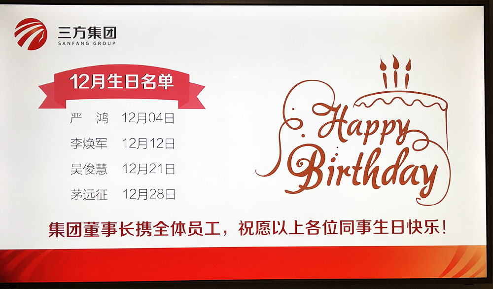 月初,集团办公室的电子屏幕已滚动播放董事长对各位同事的生日祝福。公司的发展离不开每一位员工的辛勤工作,在大家生日到来之际,董事长谨代表公司全体同仁祝福大家生日快乐!感谢大家这些年在自己的工作岗位上兢兢业业为公司作出的贡献,在以后的日子里希望再接再厉,让公司与大家共同成长!