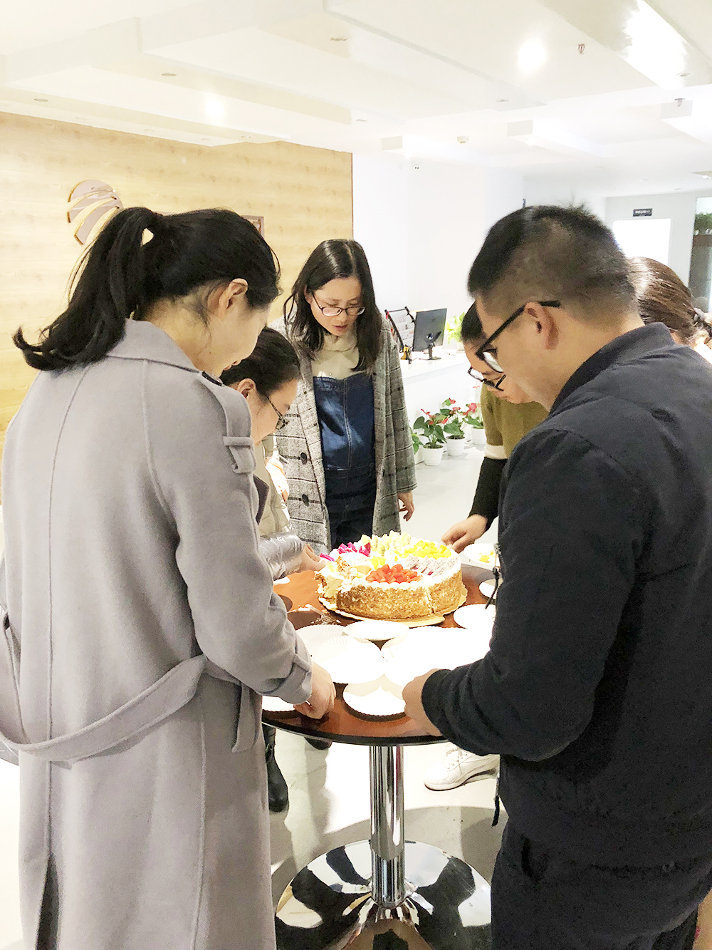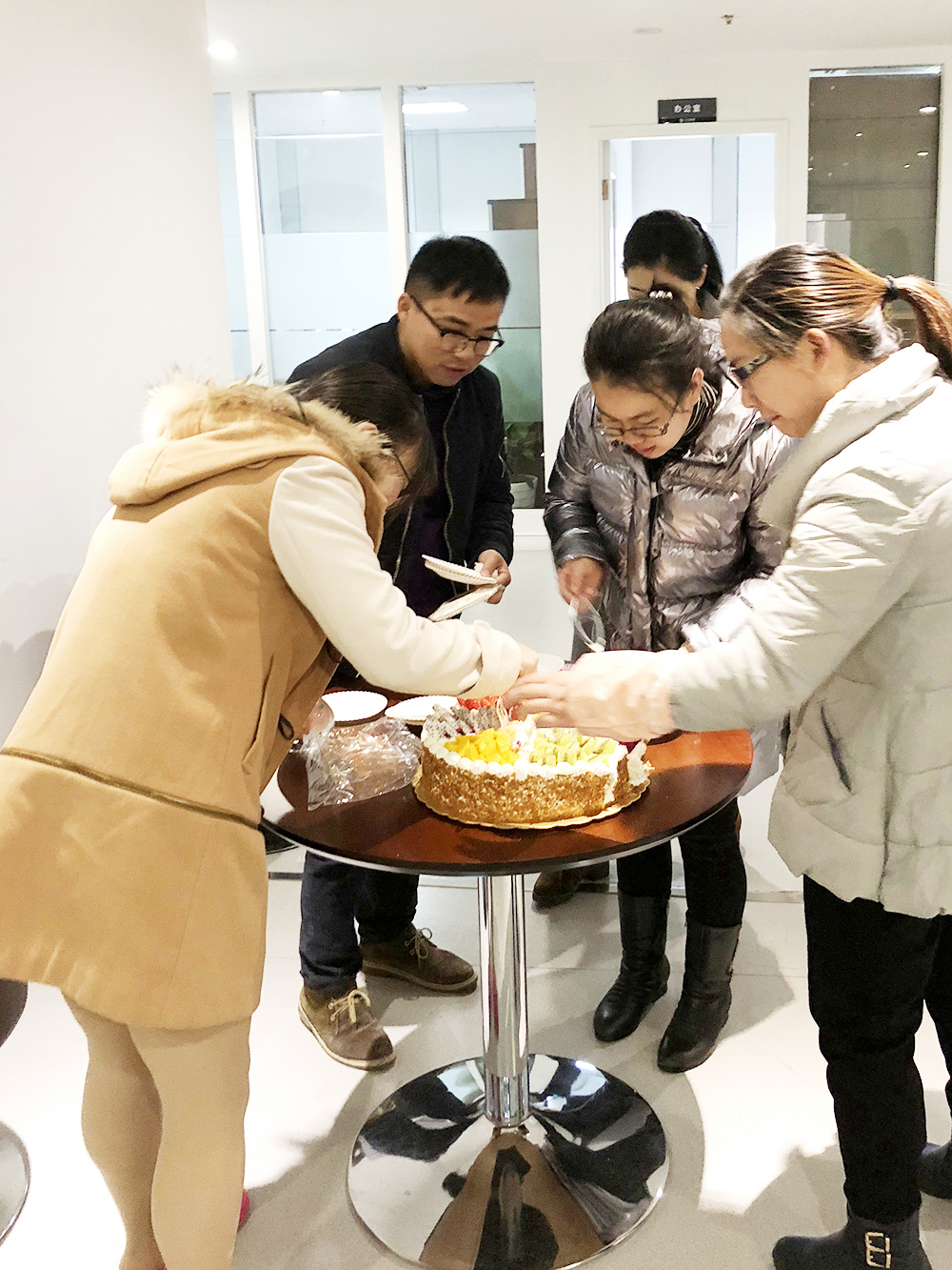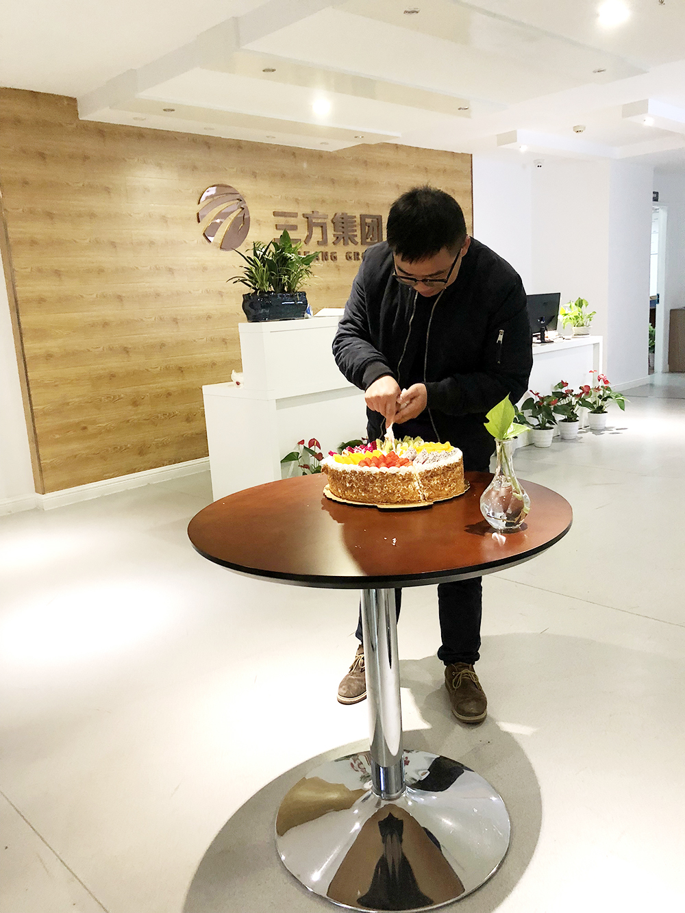 幸福常伴,情谊相牵。集团办公室为12日生日的工程部李焕军准备了水果生日蛋糕,当熟悉的旋律“祝你生日快乐,祝你生日快乐”响起,寿星愉快地为大家切起了蛋糕,并收到了来自同事间的美好祝福。