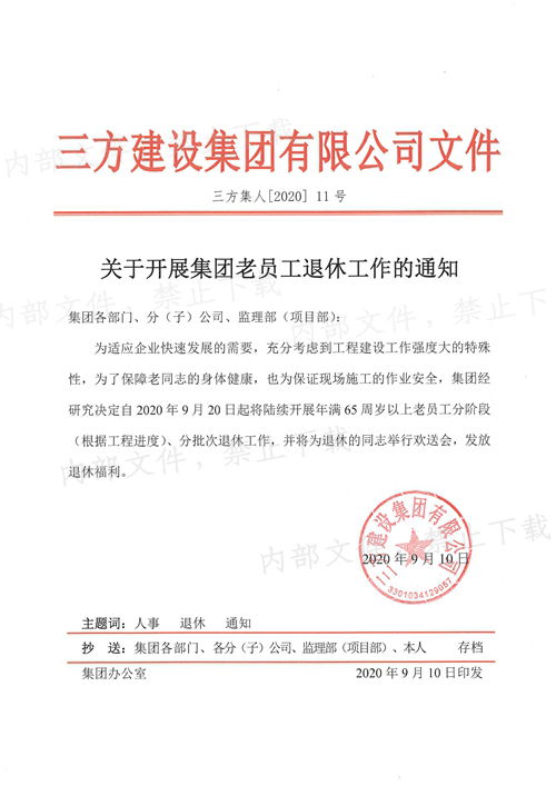 为适应企业快速发展的需要,充分考虑到工程建设工作强度大的特殊性,为了保障老同志的身体健康,也为保证现场施工的作业安全,集团经研究决定自2020年9月20日起将陆续开展年满65周岁以上老员工分阶段(根据工程进度)、分批次退休工作,并将为退休的同志举行欢送会,发放退休福利。