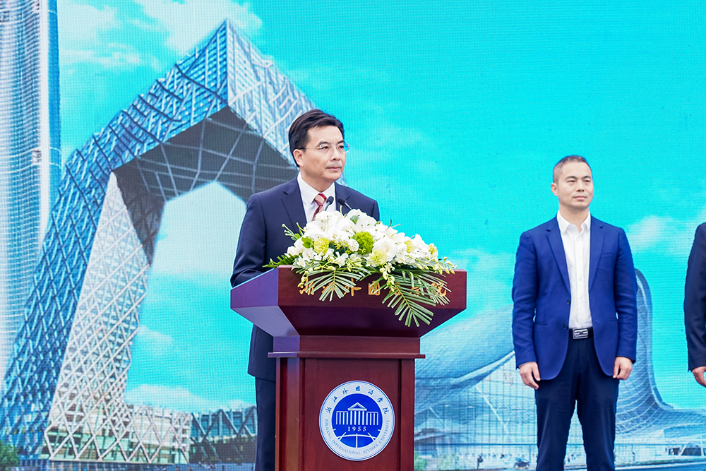 浙江外国语学院党委书记宣勇出席并致辞,他指出,教学科研及留学生生活用房扩建工程奠基是是浙外发展进程中的又一件值得祝贺的大事和喜事。宣勇强调,各参建单位要精诚合作,把好质量、进度、安全关,做放心工程、清廉工程。