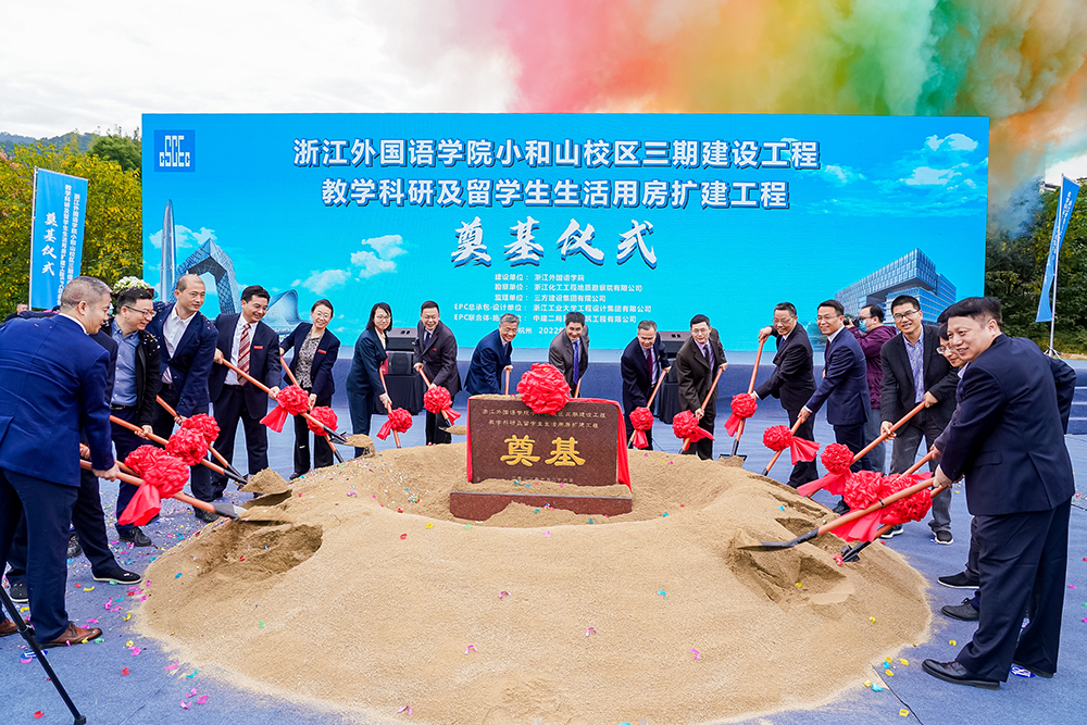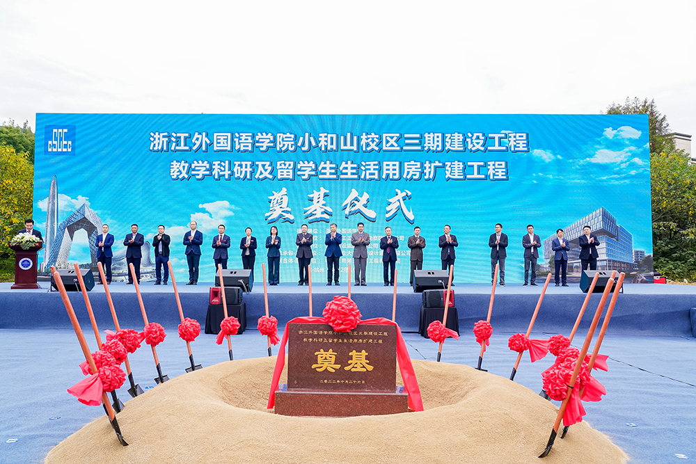 10月26日,集团监理的浙江外国语学院小和山校区三期建设工程教学科研及留学生生活用房扩建工程举行开工奠基仪式,董事长吴祖跃受邀参加,项目总监崔红桂等人陪同。