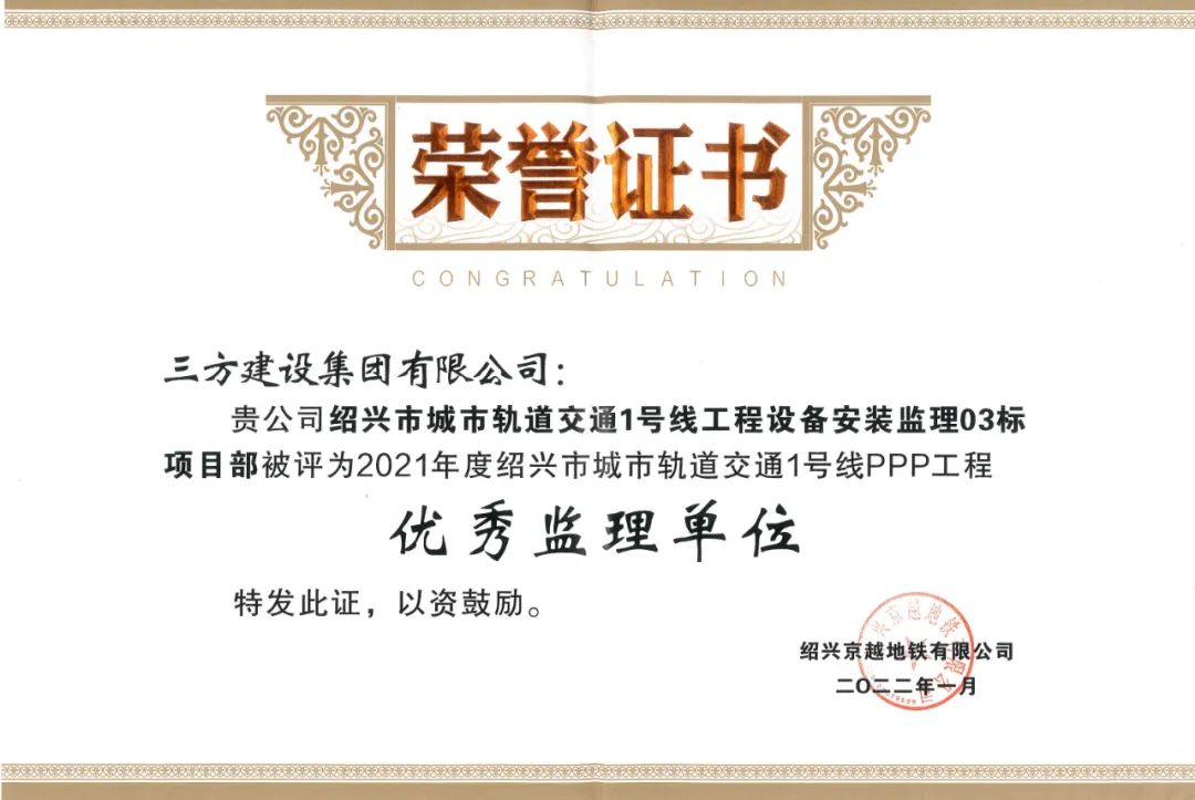 ●绍兴市轨道交通1号线设备安装监理3标被评为2021年度绍兴市城市轨道交通1号线PPP工程优秀监理单位。