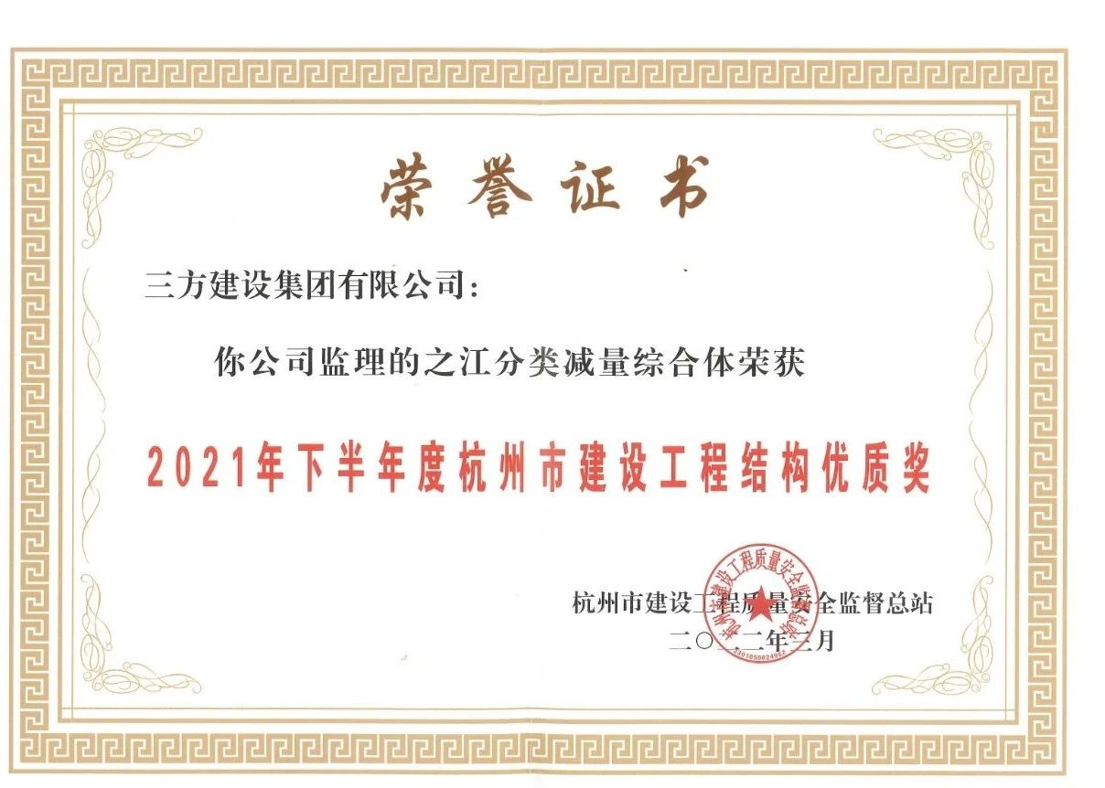 ●之江分类减量综合体荣获2021年下半年度杭州市建设工程结构优质奖工程。