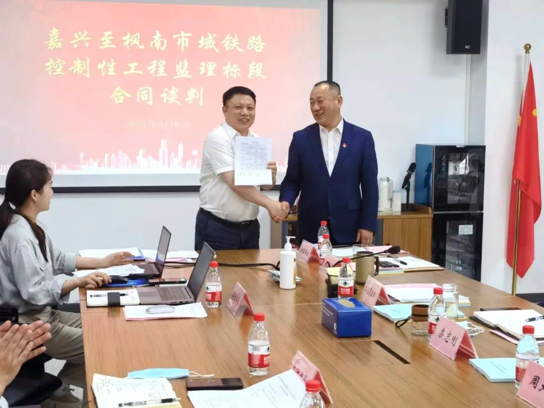 ●5月8日,集团董事长吴祖跃从嘉兴铁投市域铁路公司董事长栾志刚手中接收了嘉兴至枫南市域铁路控制性节点工程(嘉兴南站)监理中标通知书。