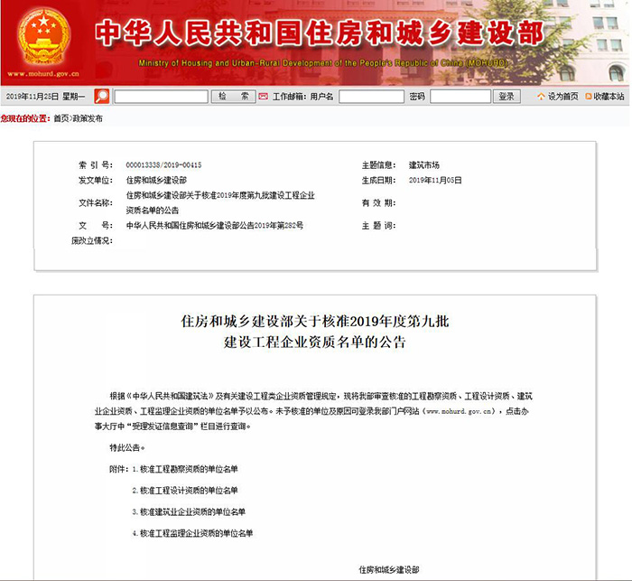 2019年11月6日,住房和城乡建设部发布了2019年第282号文《关于核准2019年度第九批建设工程企业资质名单的公告》,核准我集团申报的监理综合资质,成为