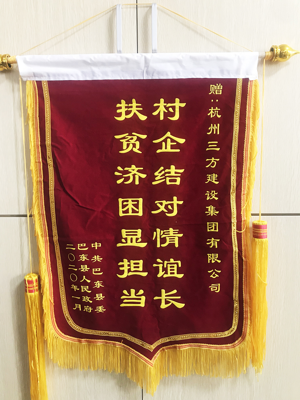 集团一直秉承于践行企业社会责任,向社会弘扬正能量,在党中央、省、市、区政府的领导下,认真贯彻落实精准扶贫、精准脱贫重大决策部署,积极投身于下城区—巴东县东西部协作工作中,在座谈会的最后,巴东县还向我集团赠送锦旗以表感谢。(综合办)