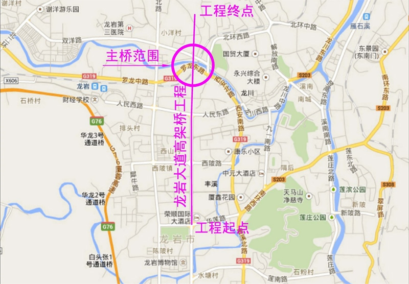 龙岩大道高架桥工程南起华莲路交叉口、北至爱亭路交叉口,全长3.4km;工程包含高架桥和地面道路两大部分,其中高架桥长2329m。
