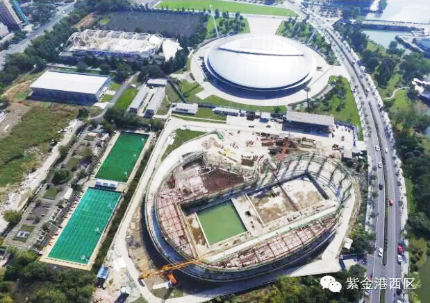 自2016年10月完成±0.000规划验收以来,游泳馆地上建筑进程稳步推进,初具规模,“钢筋铁骨”巍然耸立。11月29日上午,游泳馆项目地基与基础分部工程进行了五方主体验收,市质量监督站领导参加验收会议,经各方主体现场检查及资料核查,地基基础分部验收合格,同意进入下一步工序。目前,游泳馆项目已完成砼结构局部结顶,预计再20天左右全部砼结构结顶;钢结构工程已完成全部钢柱安装施工,屋面钢桁架完成1榀拼装,预计春节前完成主次桁架安装,力争完成全部屋面板安装。 作为紫金港校区文体中心建筑群体的重要组成部分,为顺应周边道路的曲线形轮廓,呼应与体育馆之间的圆形疏散广场,游泳馆选择了一个曲尺型的平面建筑形态,以柔化周边道路和建筑的线型冲突,整合广场的向心感。