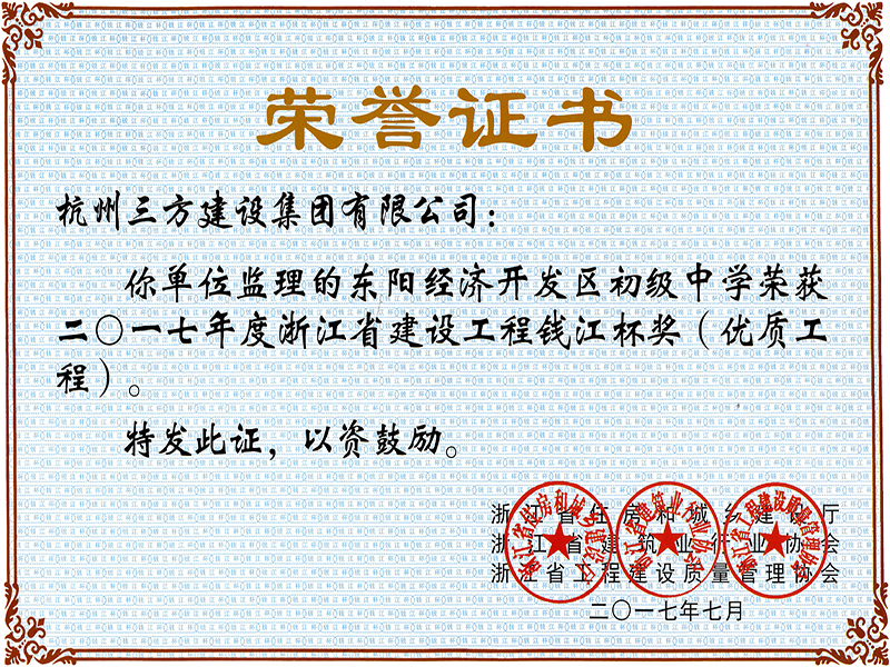 2017年东阳经济开发区初级中学荣获浙江省建设工程钱江杯奖(优质工程)