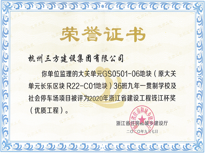 2020年大关单元GS0501-06地块36班九年一贯制学校及社会停车场项目被评为浙江省建设工程钱江杯奖(优质工程)