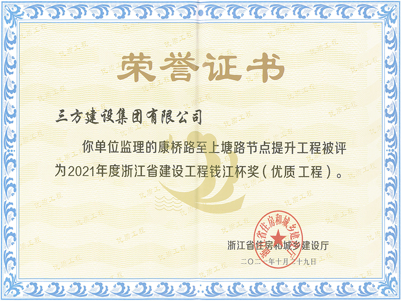 2021年康桥路至上塘路节点提升工程被评为浙江省建设工程钱江杯奖(优质工程)